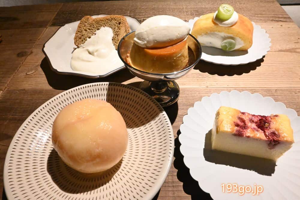 シフォンケーキ、シャインマスカットのロールケーキ、バスクチーズケーキ、プリン、丸ごと桃タルトと、カフェのような本格的なラインナップ。