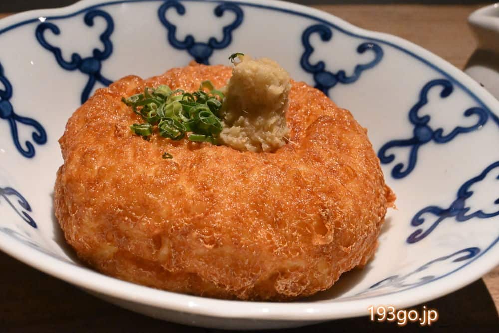 博多の三原豆腐店のまぼろしの厚揚げ。中は熱々フワフワの優しい味わい。おろし生姜とネギで。