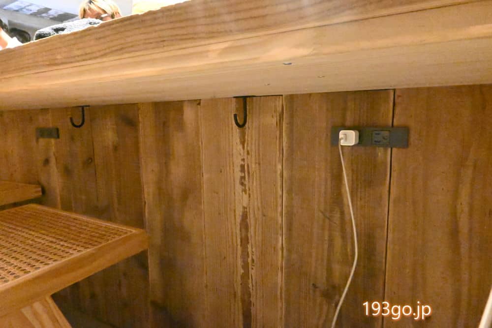 足元にコンセント、壁にもバッグ用のフックがたくさん。