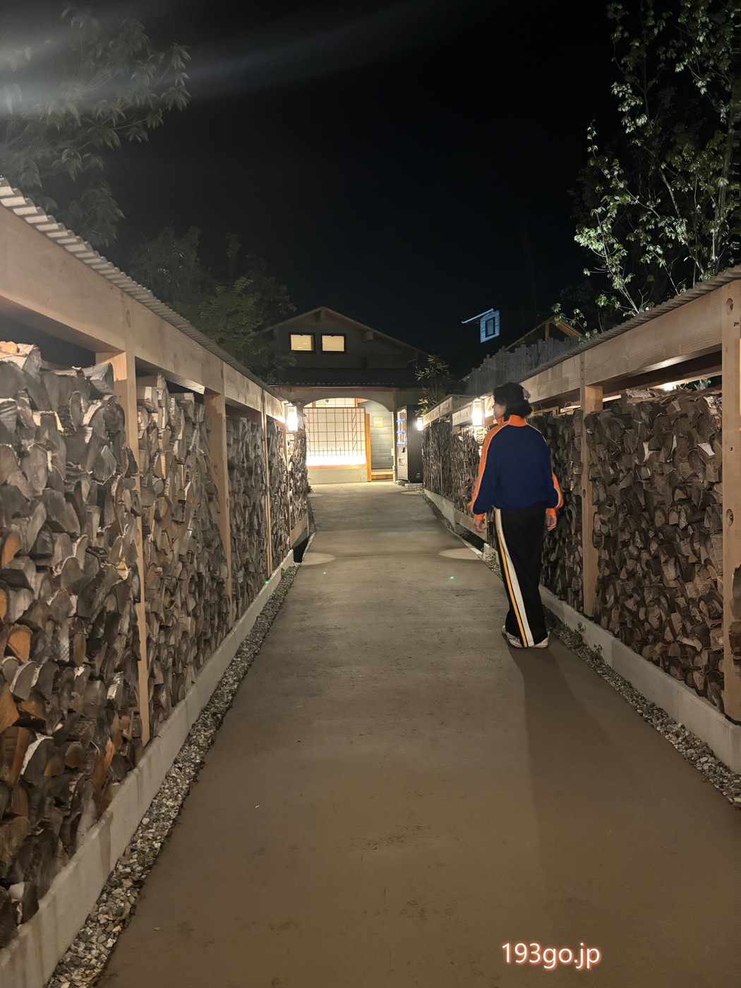 敷地内はログハウス調で薪が積み上げられた回廊を進んでいく。
