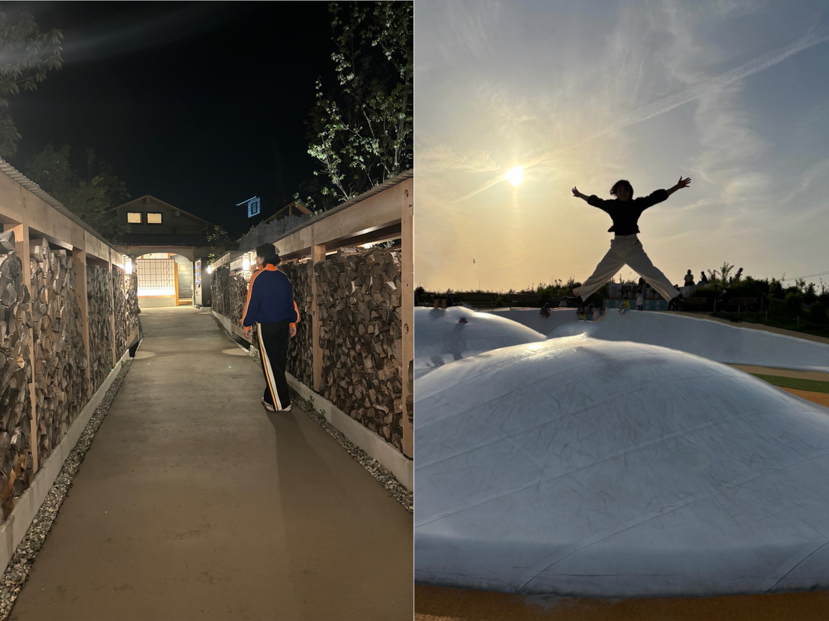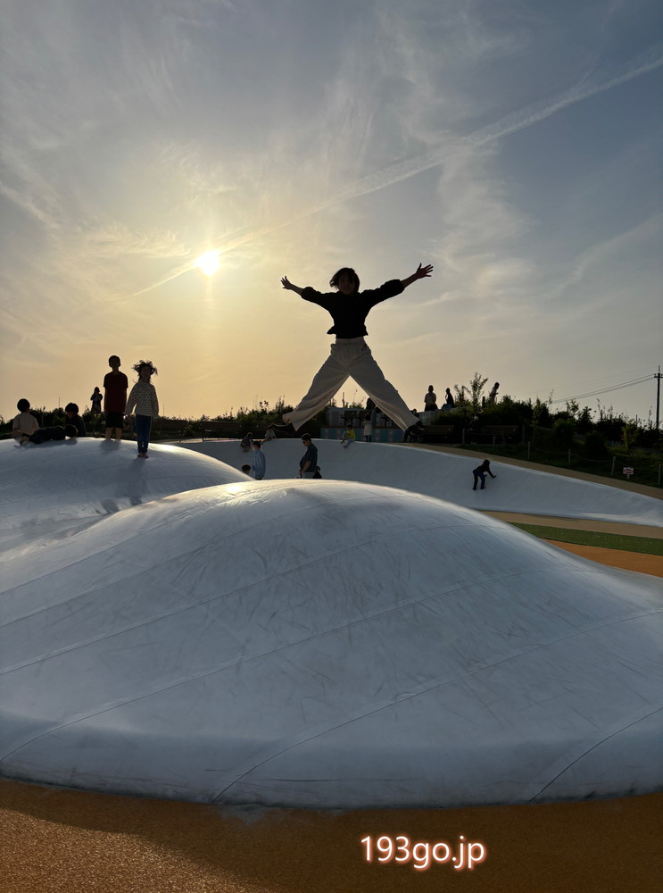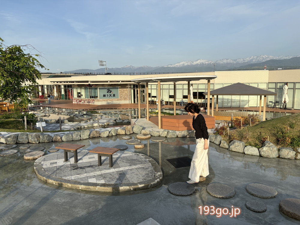 建物内にはフードコート、物販(お土産)、直売所、キッズコーナーが備わり、外には水辺エリア、とんだり跳ねたりできるトランポリン「ふわふわドーム」、築山の斜面を利用した広くて緩やかなすべり台があり、目の前には北アルプスが広がりのびのびと遊べる。