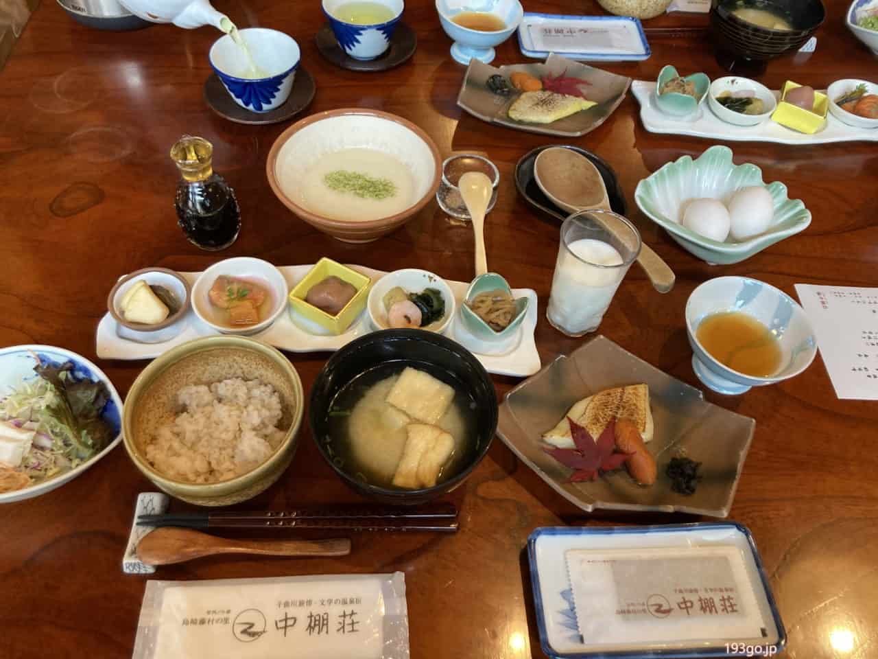 朝からテーブルいっぱいに、品数豊富な料理が並ぶ旅館での朝ごはんは格別。