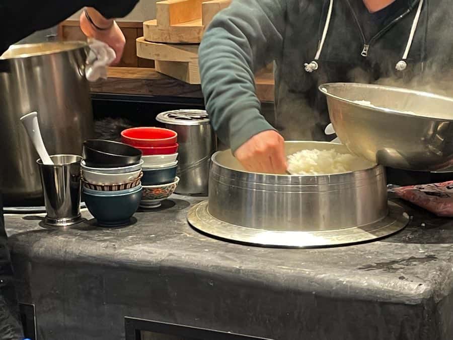 精米したてのお米を羽釜で炊き、新鮮な海産物とともに味わう。