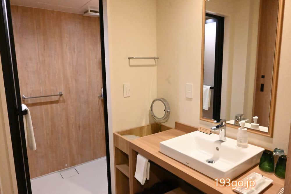 バスルームも木の温もりを感じる独立式のシャワーブース、トイレ、洗面台。