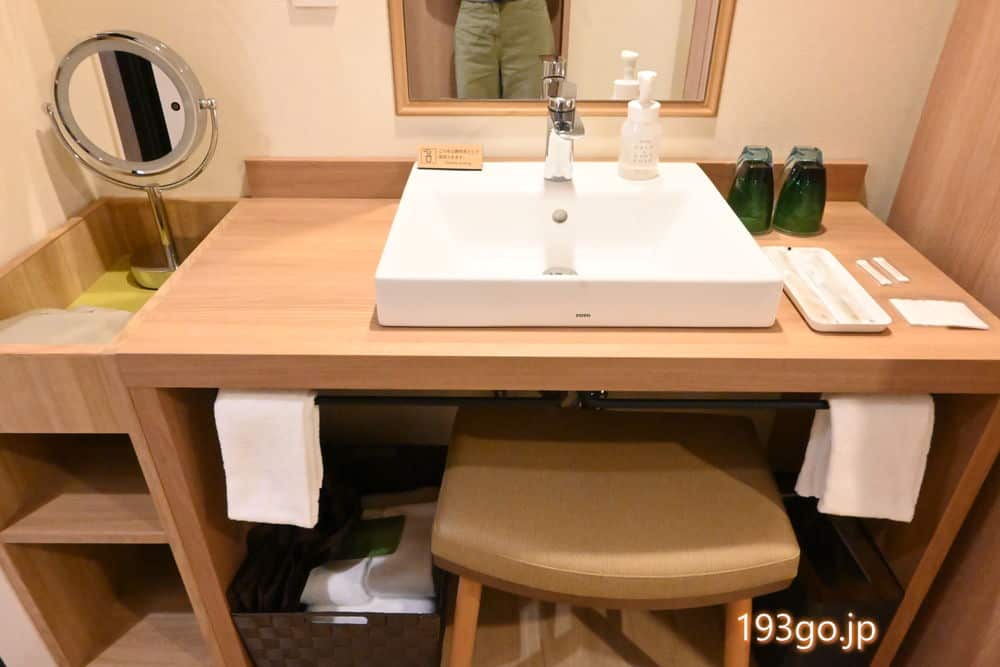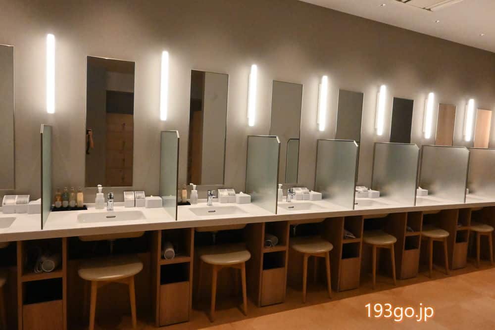 パウダースペースにドライヤー、クレンジング、化粧水などのスキンケア用品が揃う。