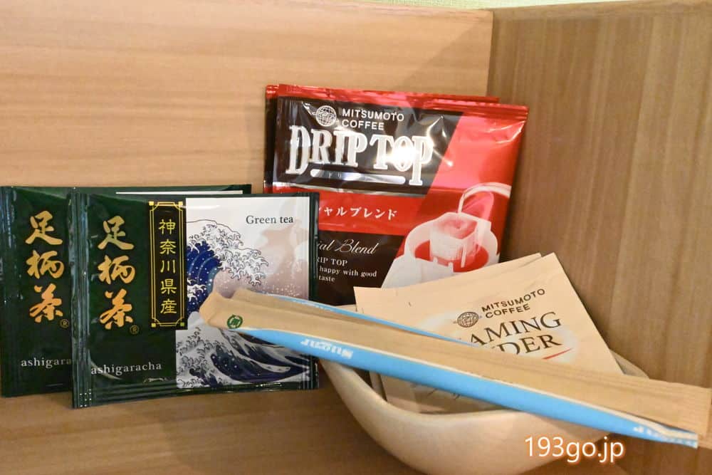 冷蔵庫、金庫、湯沸かしポット、ペットボトルのフリーウォーター、グラス。