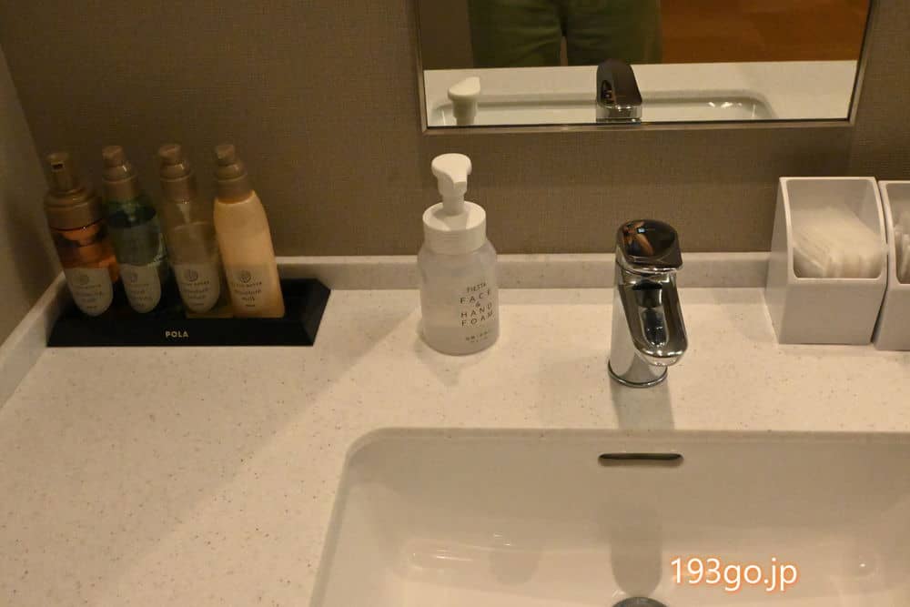 ハンドソープや、バスアイテム一式。大き目の鏡が設置され、卓上ミラーの用意も。