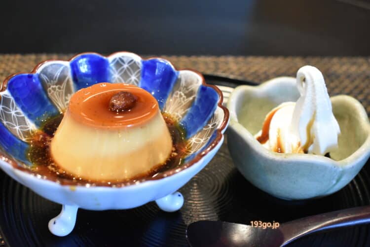ラムレーズンがトッピングされたなめらプリンとソフトクリーム黒蜜がけ