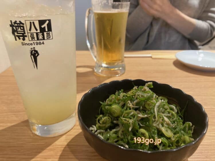 京だし巻きと、ピリ辛じゃこねぎ和えを頼み、先に乾杯!