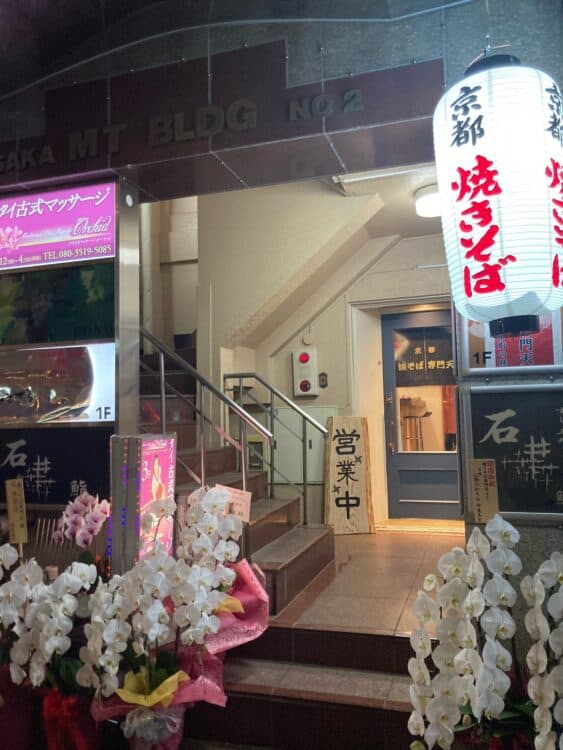 「京都 焼きそば」と提灯が光る、入口に胡蝶蘭が。