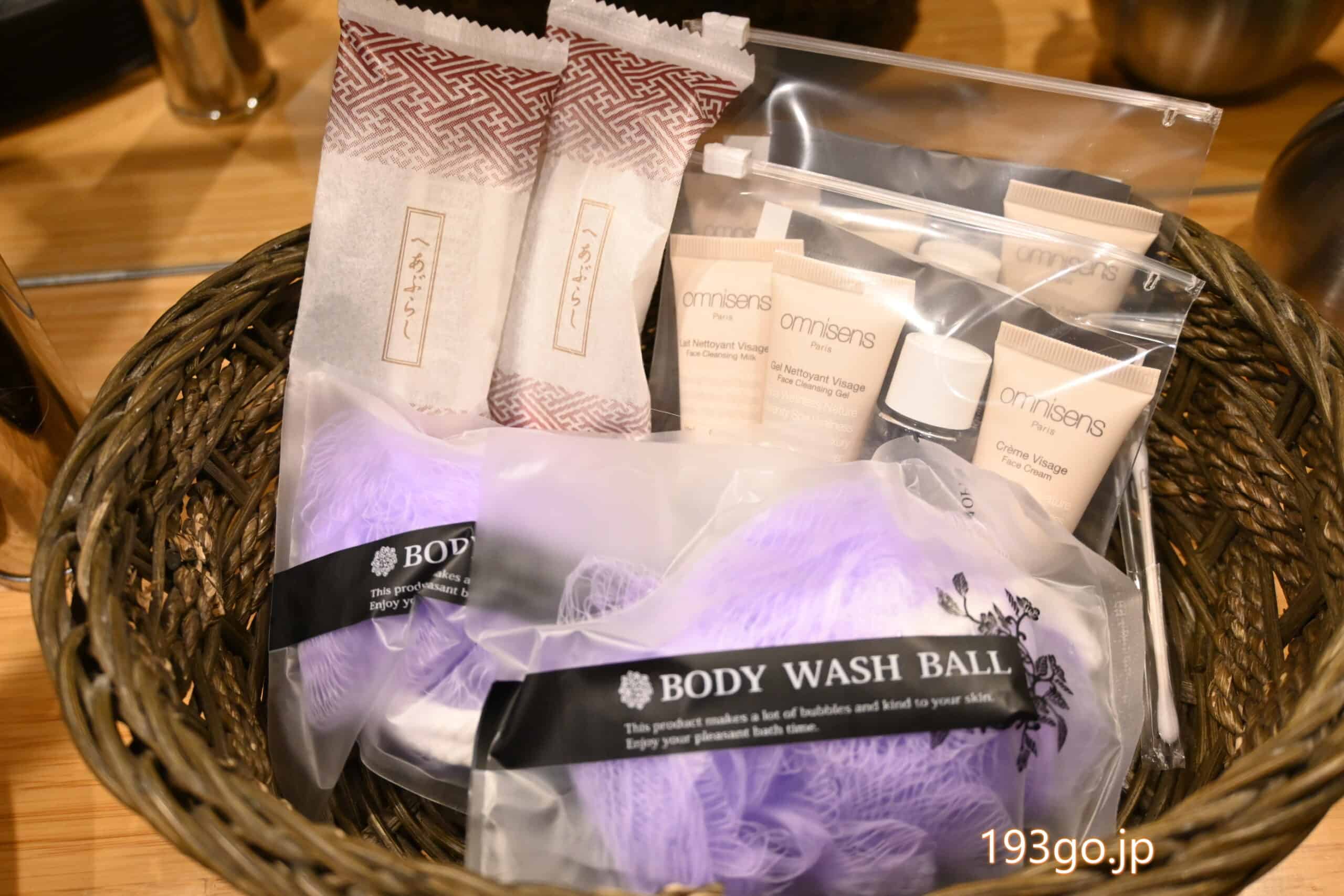 ドライヤーやタオル、ボディタオル、スキンケアセットに歯ブラシ、ヘアブラシなどのアメニティも揃う。上下別のパジャマ(作務衣)&足袋も。