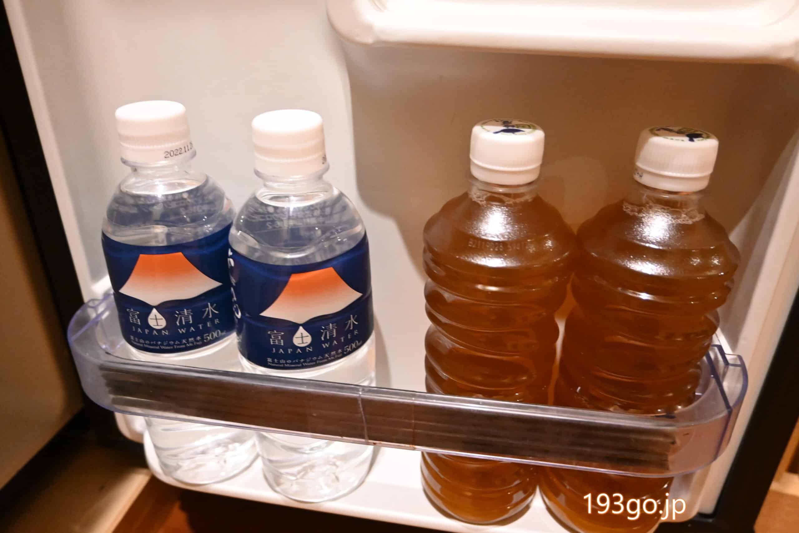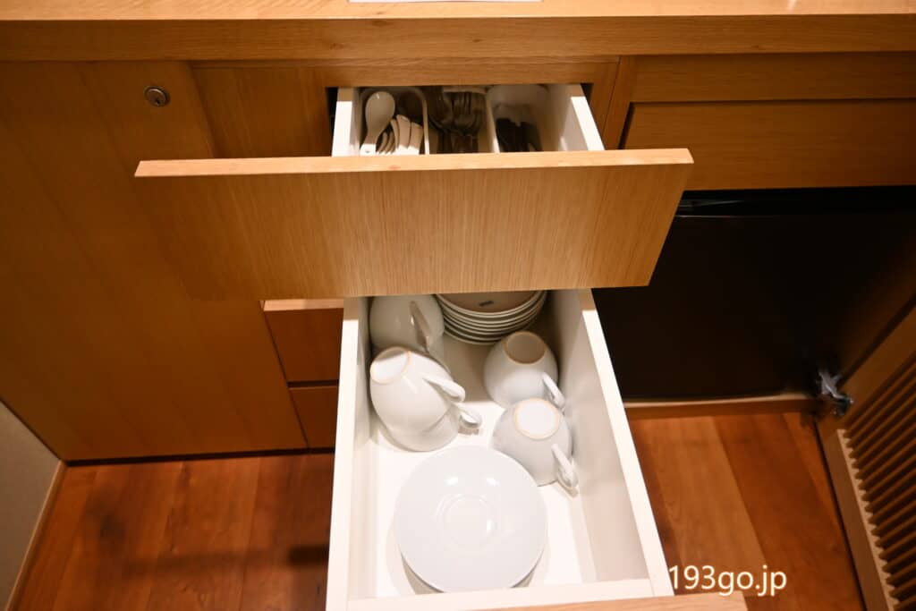 冷蔵庫にフリーウォーターとお茶が2本ずつ、コーヒーメーカー、お茶セットに、食器類も完備。
