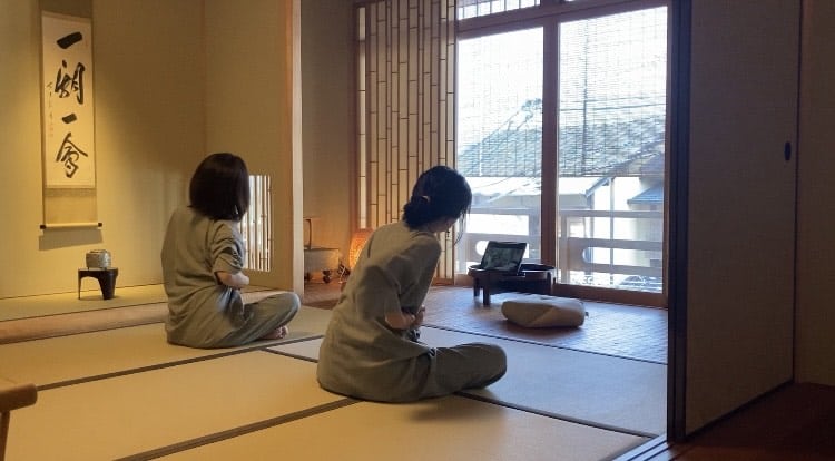 朝はお揃い作務衣で和室ヨガ。窓からは紅葉や風情ある町並みを眺めながら清々しい朝を迎えた。