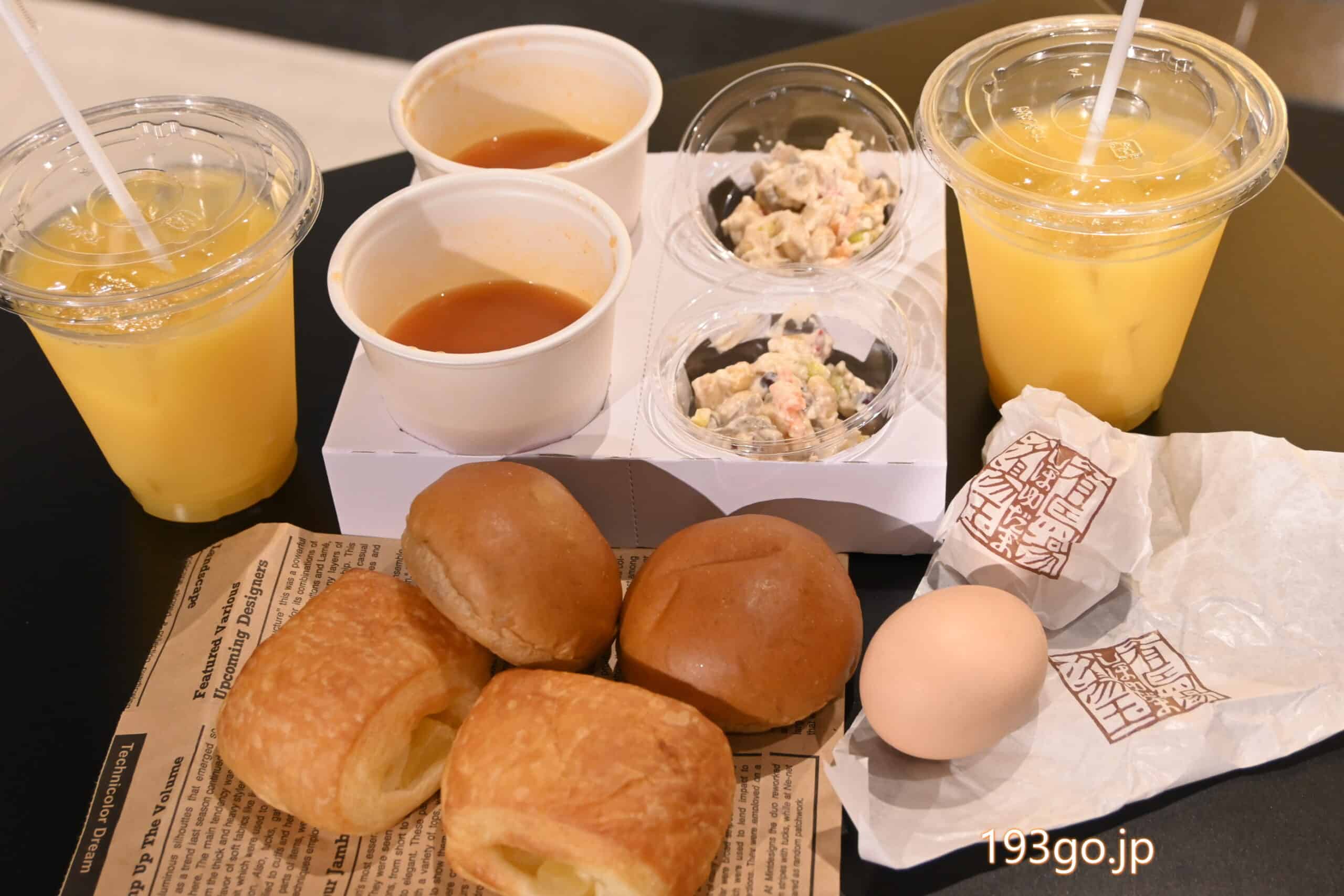 ミニサイズのパン2種とスープ、サラダ、ゆで卵&ドリンク1杯。