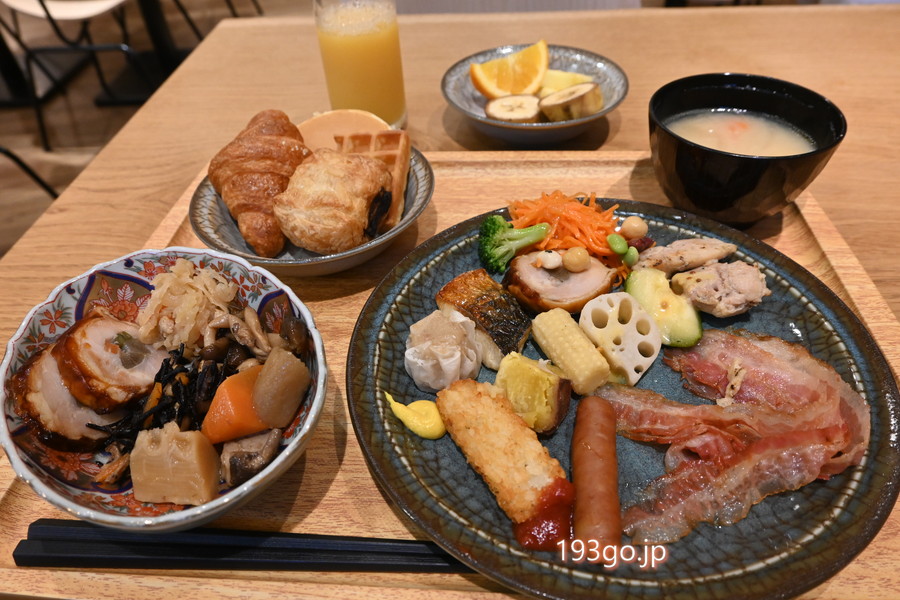 煮物や焼き魚、味噌汁などの和食に加え、パンやフルーツ、ジュースなど洋食も揃っていて、朝からしっかりエネルギーチャージ。
