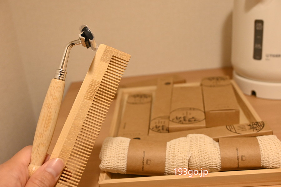 上下セパレートの柔らかいパジャマや、竹製のヘアブラシ・歯ブラシ、ボディタオル、ティーセットなどのアメニティも用意されていて、快適に過ごせた。