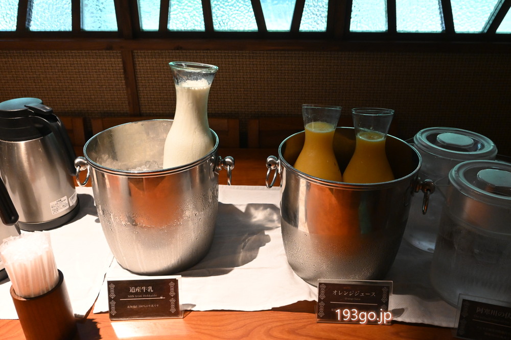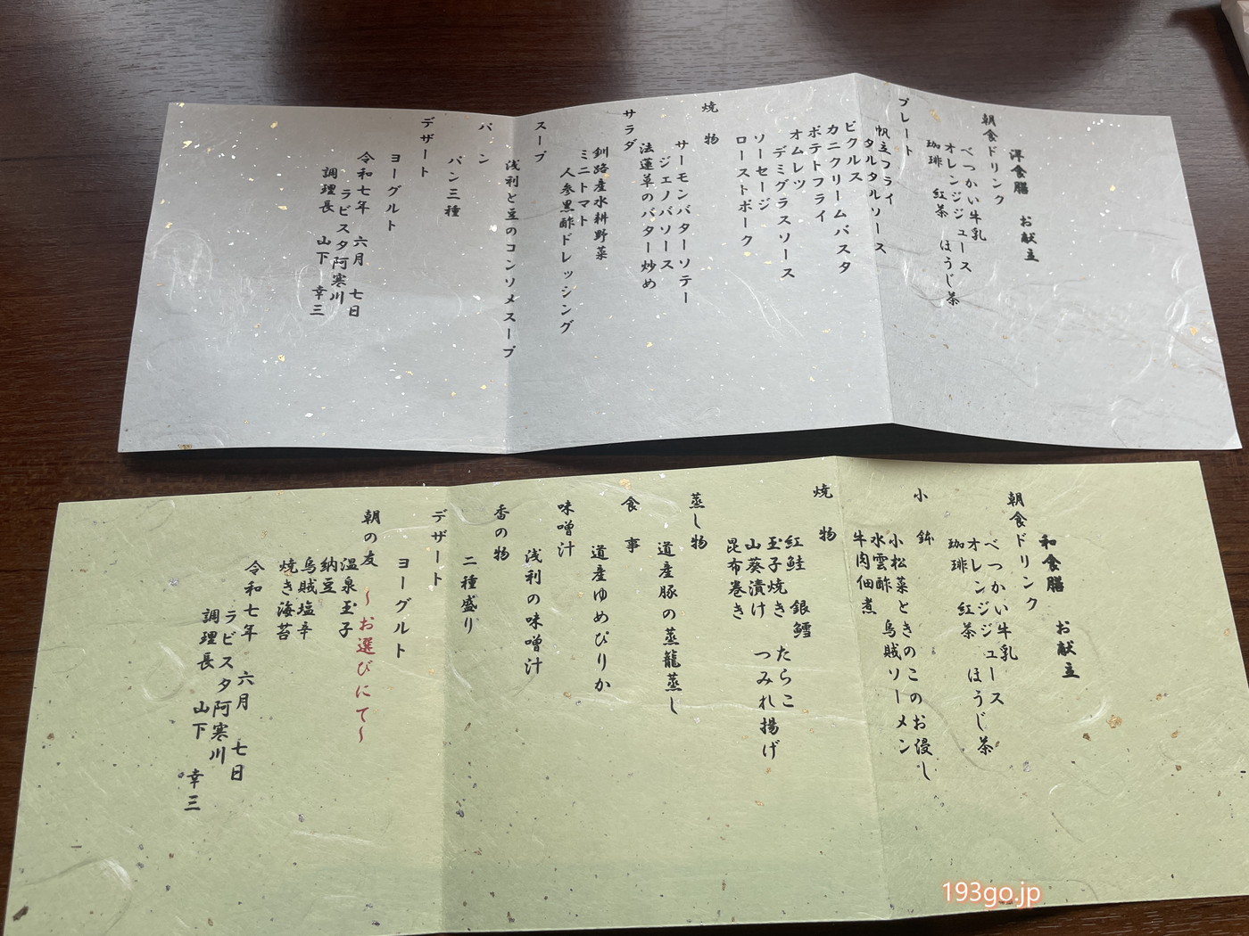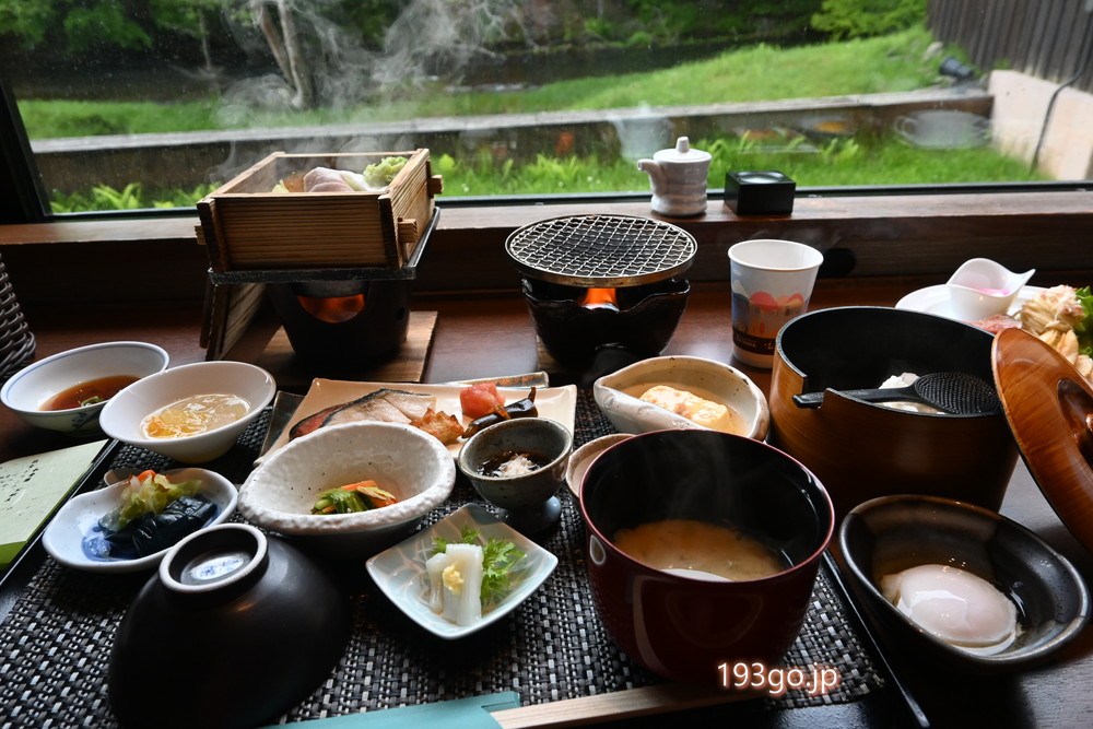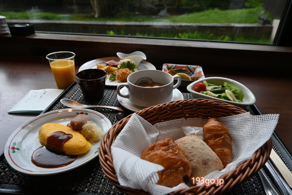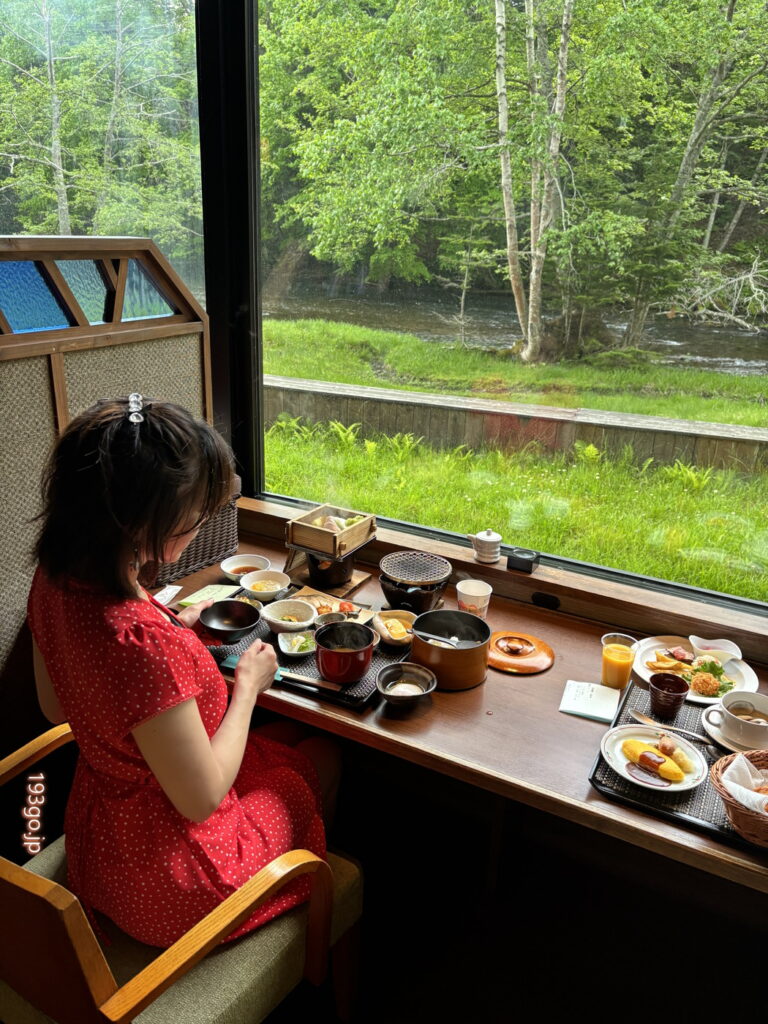 和食膳は鮭や銀鱈、道産豚の蒸篭蒸しなど品数豊富で、洋食膳はホタテフライやカニクリームパスタ、オムレツにパン三種とボリューム満点。阿寒川を眺めながらいただく贅沢な朝ごはん。