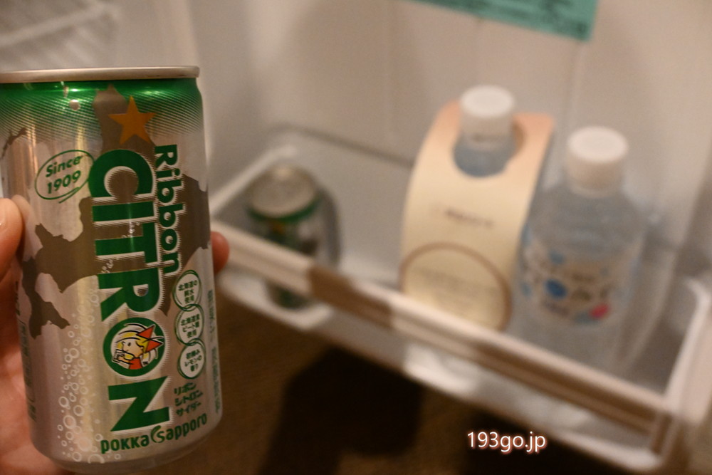阿寒湖菓子の「釧路湿原紀行」や、冷蔵庫にはミネラルウォーターと北海道限定サイダー・リボンシトロンも。