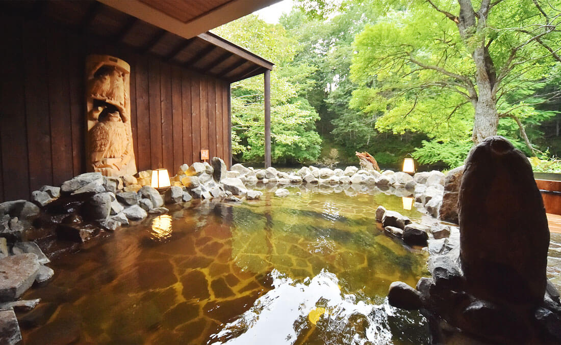 15時から翌11時まで入れる大浴場は、石風呂や岩風呂、熱めの桶風呂があり、露天風呂からは阿寒川が目の前に。川のせせらぎと木々を眺めながら、体の芯から温まるお湯につかる時間は格別。