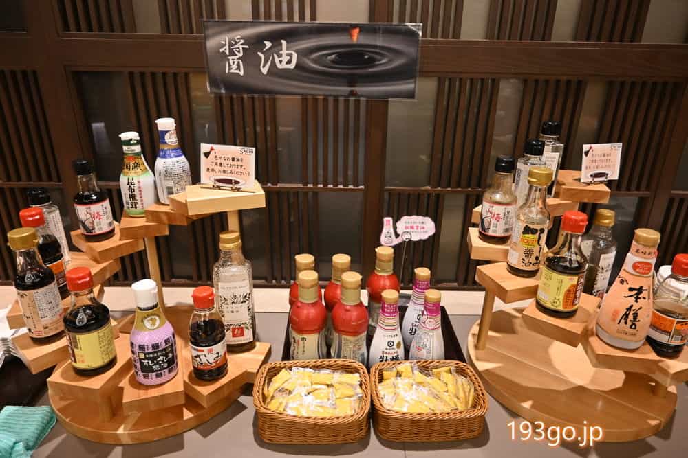 ご飯は、あきたこまち、おぼろづきの2種類。醤油は、牡蠣、しじみ、梅醤油など10種類以上置かれてる。