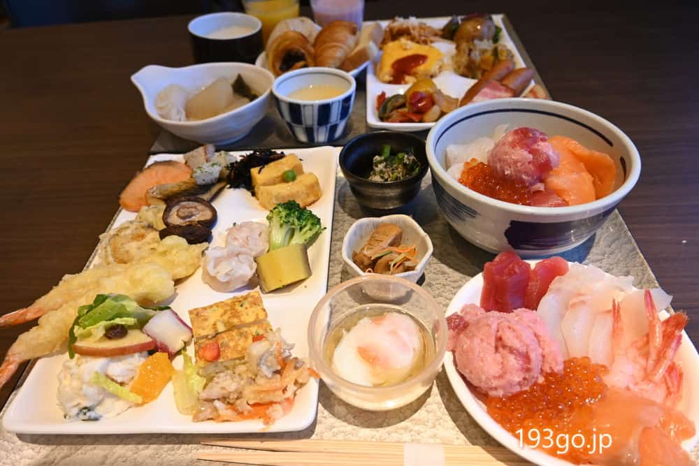 スクランブルエッグやオムレツ、ベーコン、ソーセージ、天ぷら、焼売、納豆、温泉卵、焼き魚!作り立て料理がどんどん運ばれてくる。