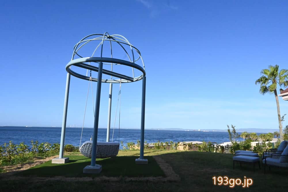 ブランコやソファーが置かれた海風を感じられるテラスへ。