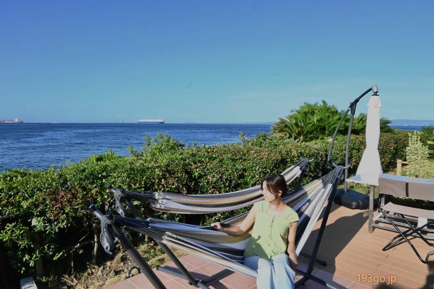 専用のバーベキュースペースには、ハンモックもあり海風をあびながら、東京湾を一望できる海辺のキャンプ。