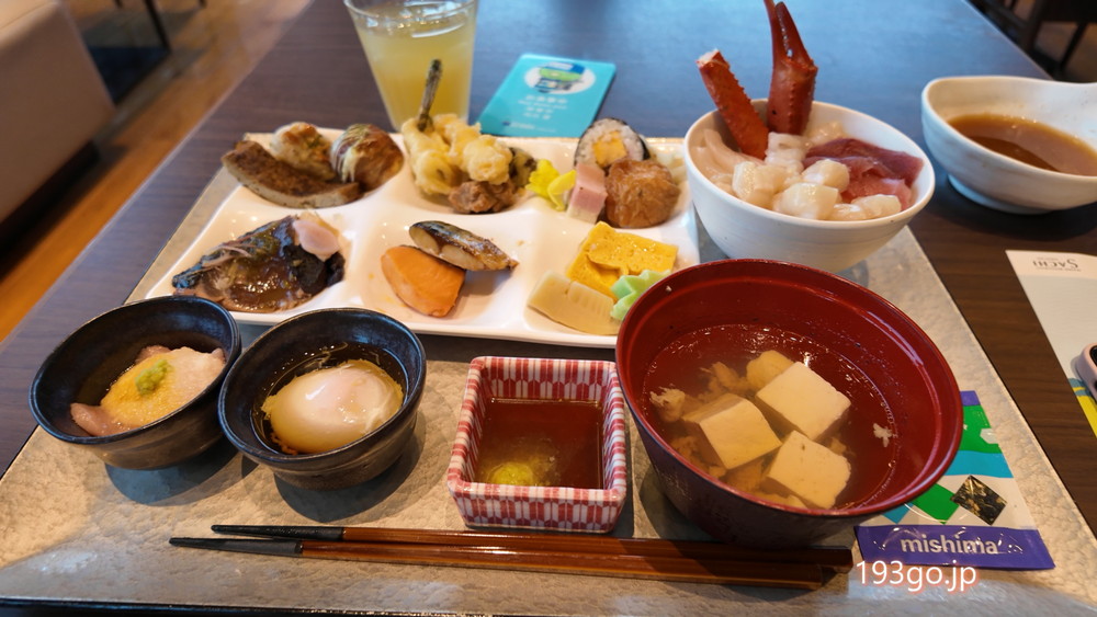 何度も入りたくなる絶景大浴場は、寝る前と朝風呂に、そして具材をたっぷりトッピングした夜鳴きそばと、和食がメインの豪華海鮮の朝食ブッフェ。