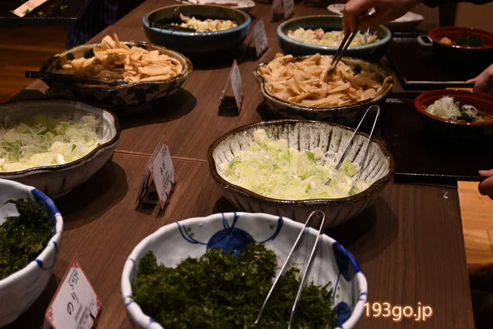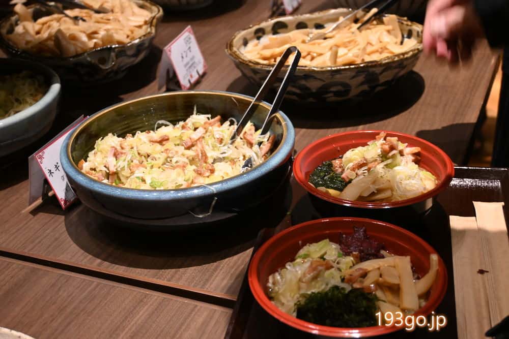 大鍋で湯がいた麺とスープを入れた丼を受け取り、次にトッピングコーナーへ。