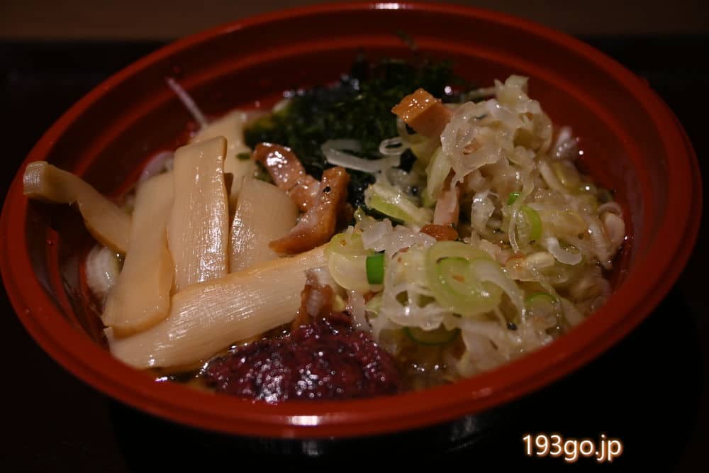 トッピングは、メンマ、ネギ、あおさ海苔、梅肉、ネギチャーシューとある。