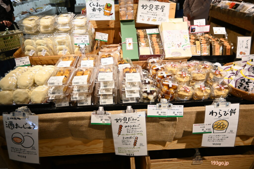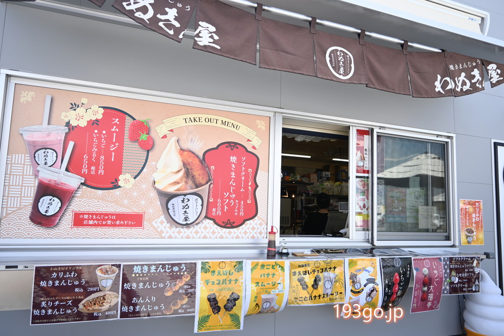「わぬき屋」では群馬名物の焼きまんじゅうや焼きまんじゅうソフト、いちご大福串にスムージーなど。