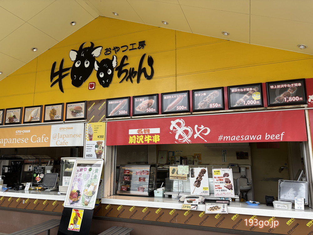外の売店「おやつ工房 牛ちゃん」では前沢牛串や前沢牛コロッケ、前沢牛入りハンバーガーなどのホットデリ。