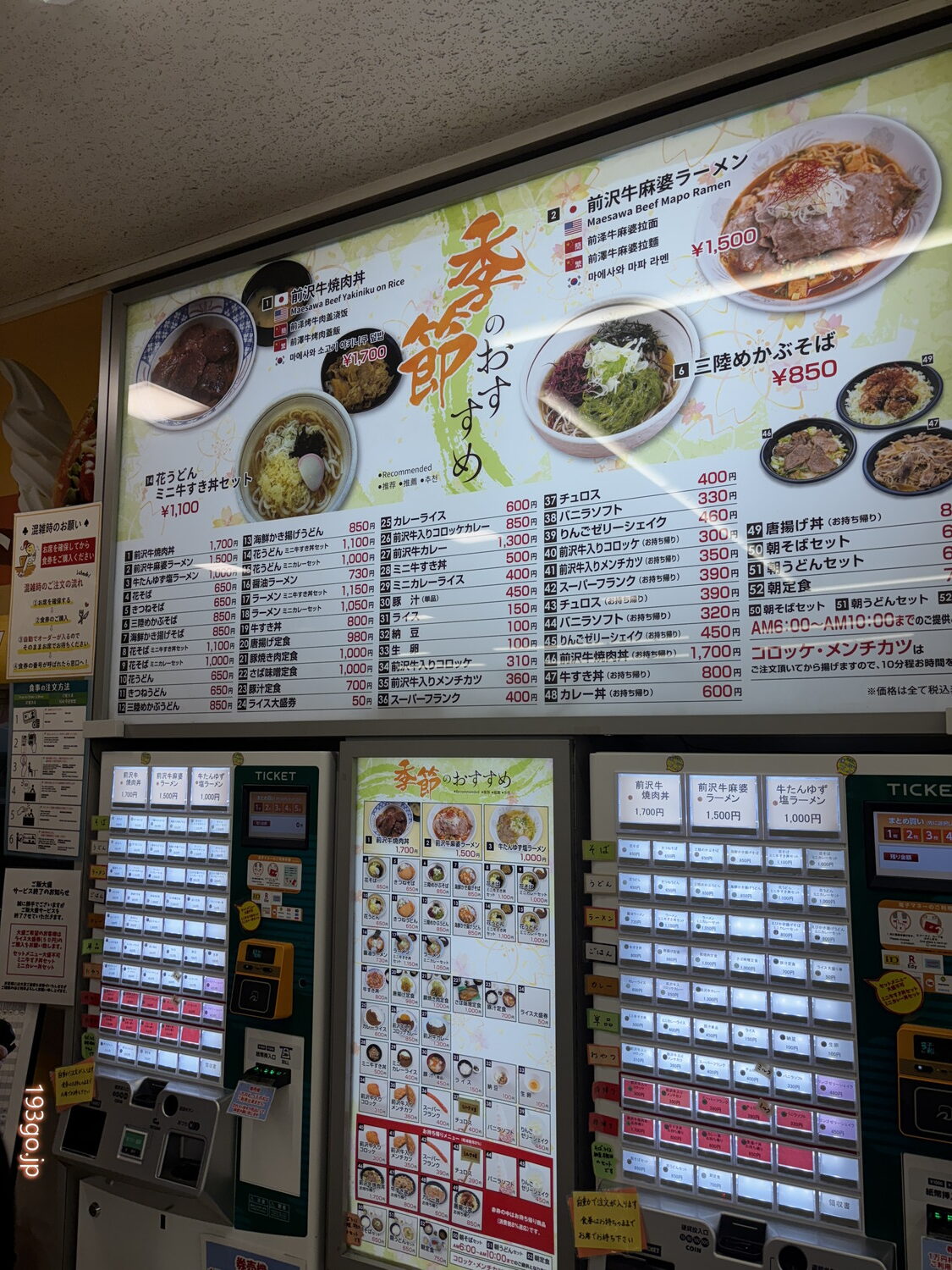 フードコートでは、前沢牛焼肉丼、前沢牛麻婆ラーメン、前沢牛カレー…、三陸めかぶそばも美味しそう。地元にちなんだグルメが勢ぞろい。