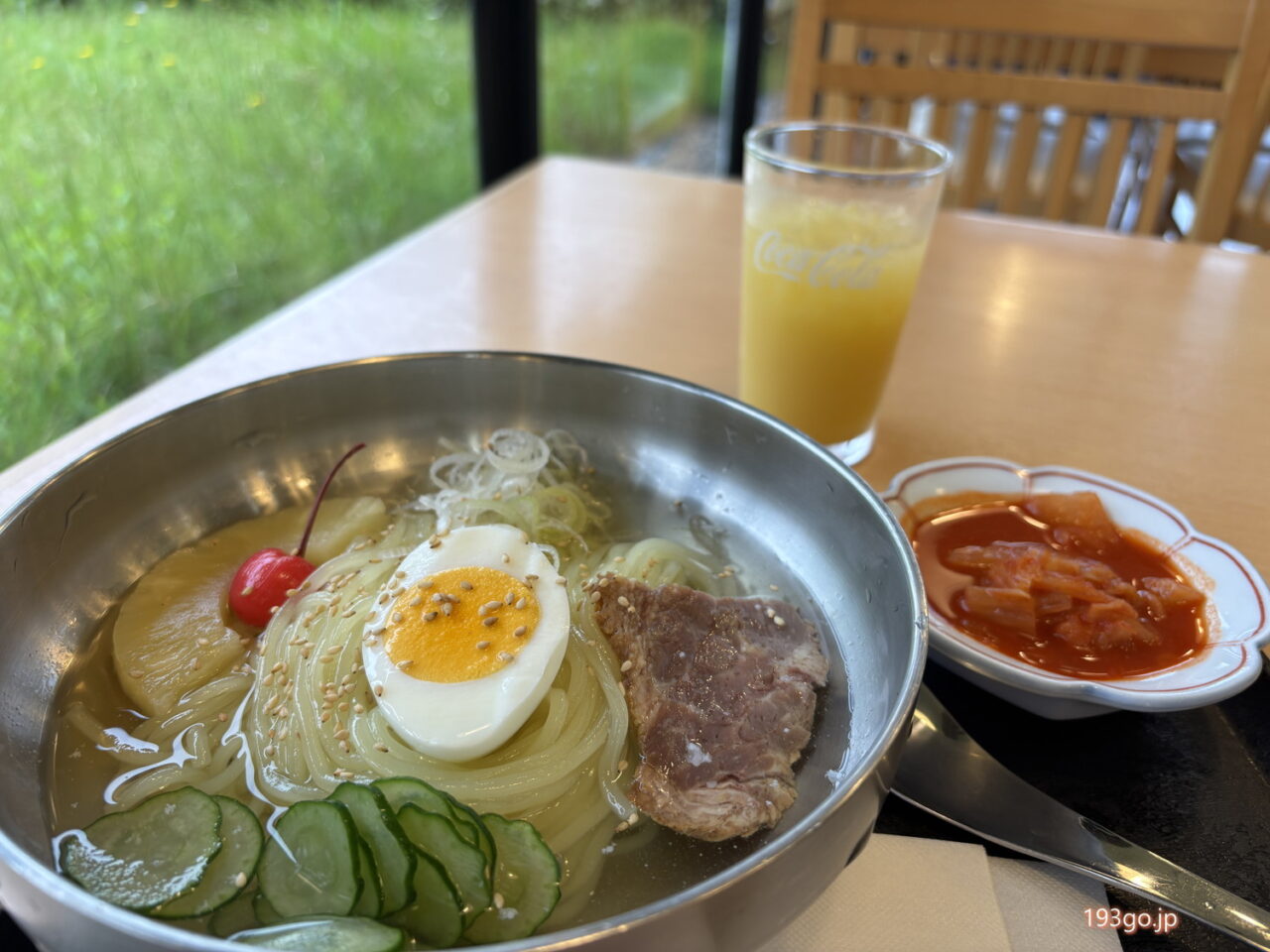 盛岡冷麺は、ゆで卵やチャーシュー、きゅうり、さくらんぼ、パイナップルなどがトッピングされレトロ可愛いビジュアル。 キムチ付き。