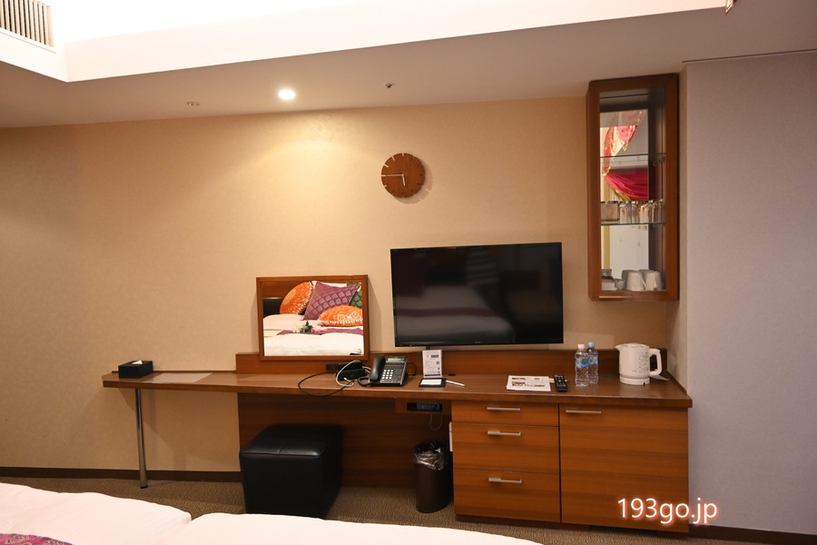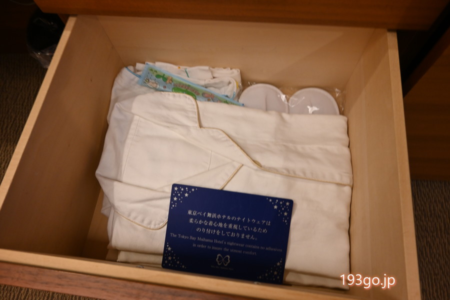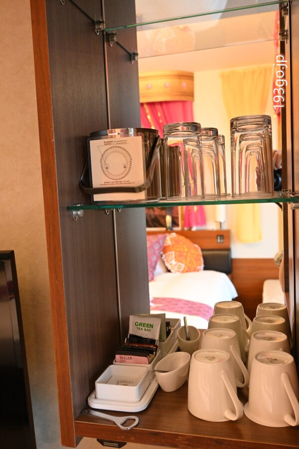 カップやティーバッグ、電子ケトル、ミネラルウォーター、パジャマ、スリッパなどのアメニティが一通り。