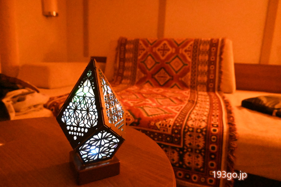 室内は、アラビアンライトやランタン、ランプ、ブーケ、像の置物などのグッズの他、