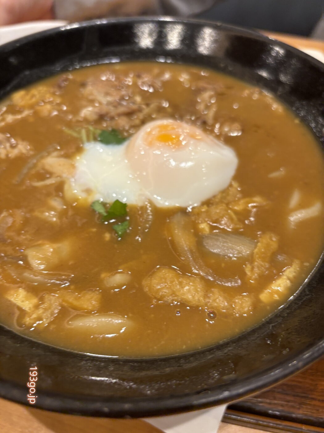 肉玉カレーうどんには、卵を落として。