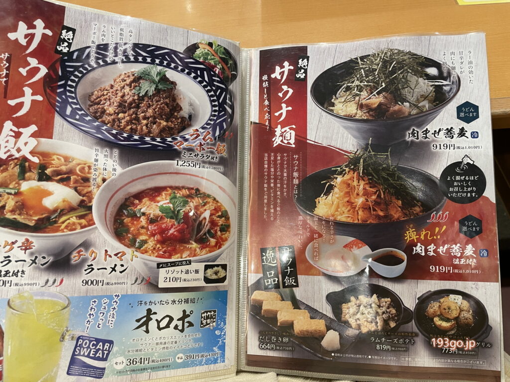 メニューはカレーやカレーうどん、蕎麦、サウナ飯、自家製豆腐、おつまみ、魚料理など充実。