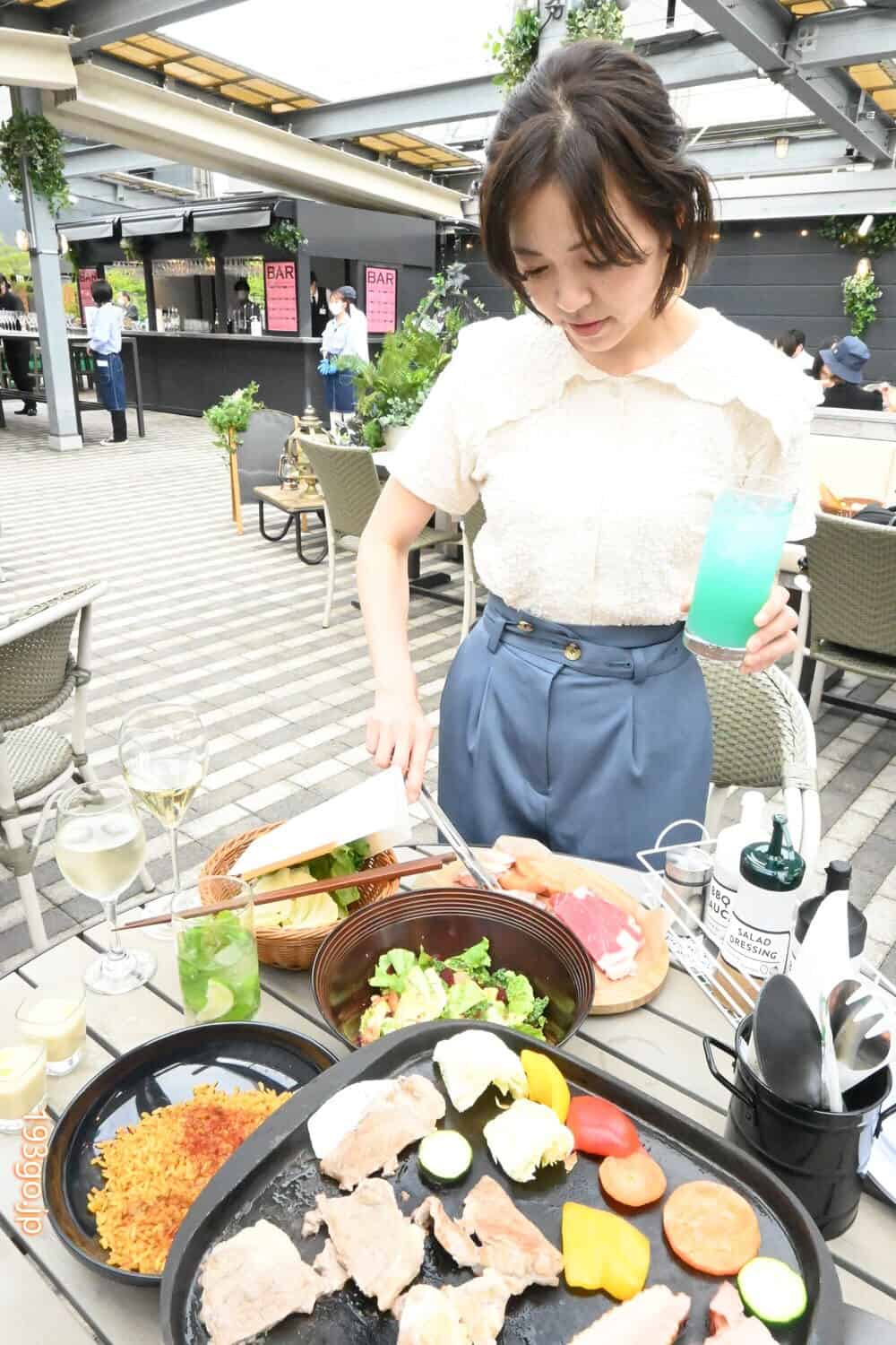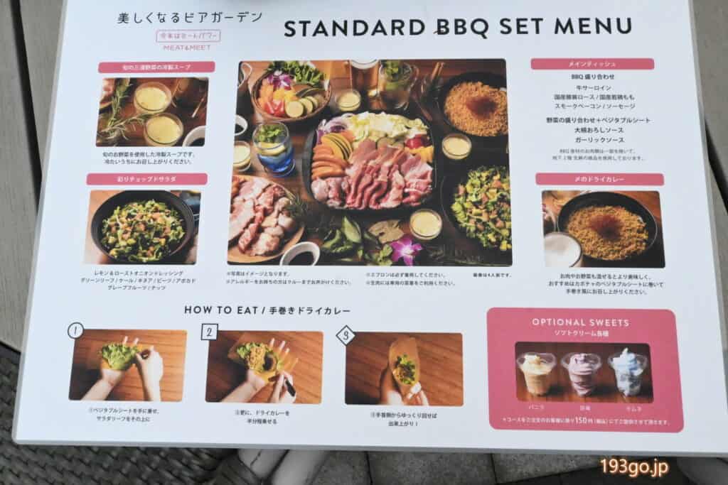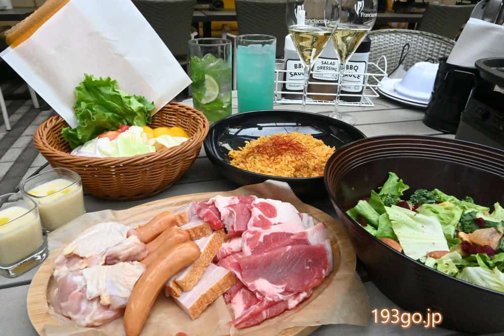 この日はスタンダードBBQ「ミートパワー」コース:⼀⼈6,000円(120分飲み放題)を堪能。