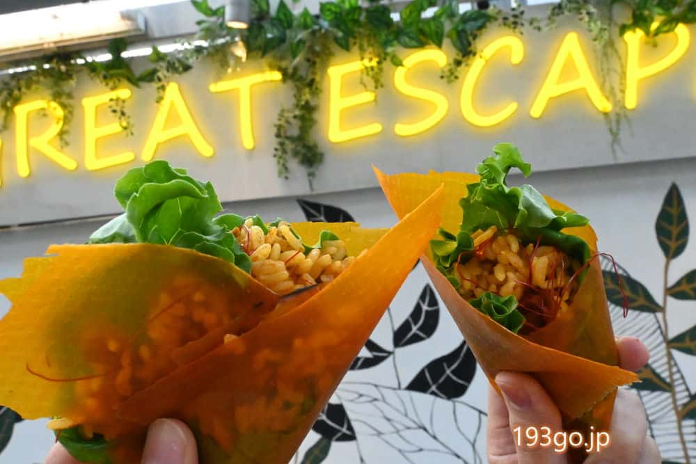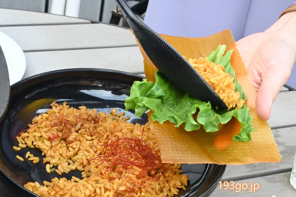 ベジタブルシート(かぼちゃを練り込んだ薄い生地)にドライカレーを巻いて食べるタコスの様なフード。