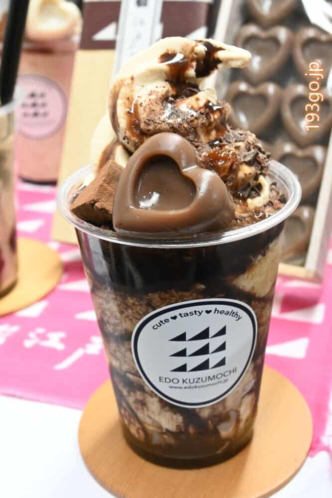 チョコレートの様なハート形の久寿餅(くずもち)やカカオニブのザクザク食感など、