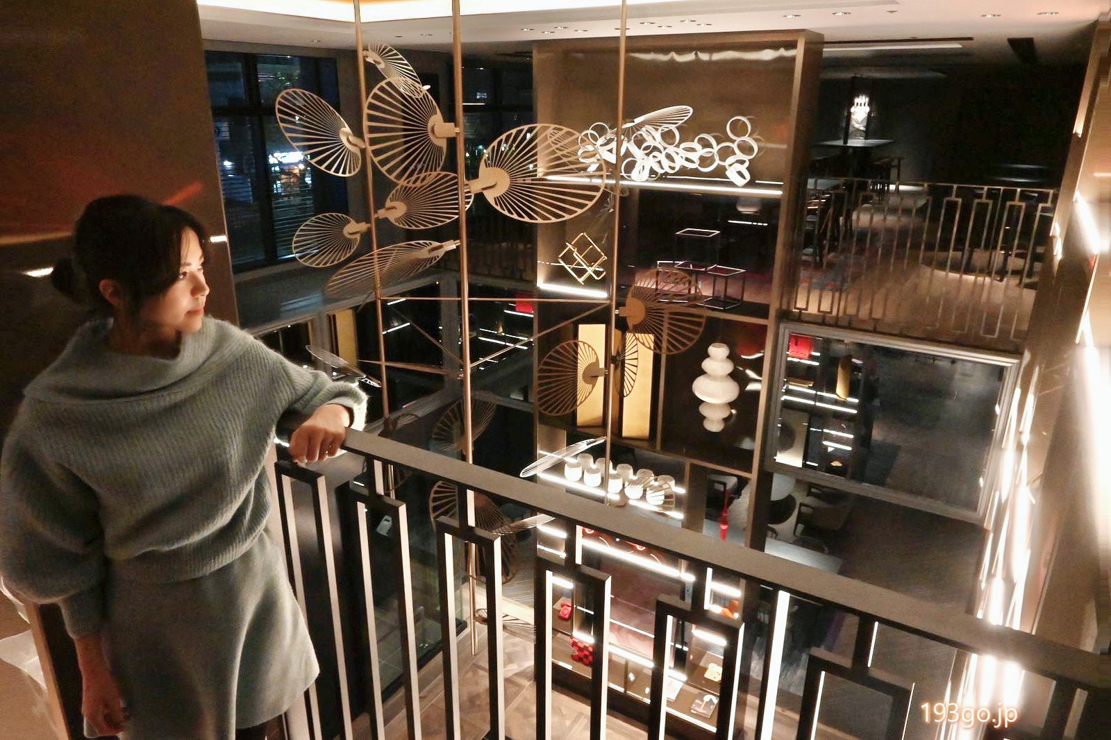 エントランスを入った吹き抜けのロビーは、うちわや着物など古き日本の文化をデザインに取り入れている。