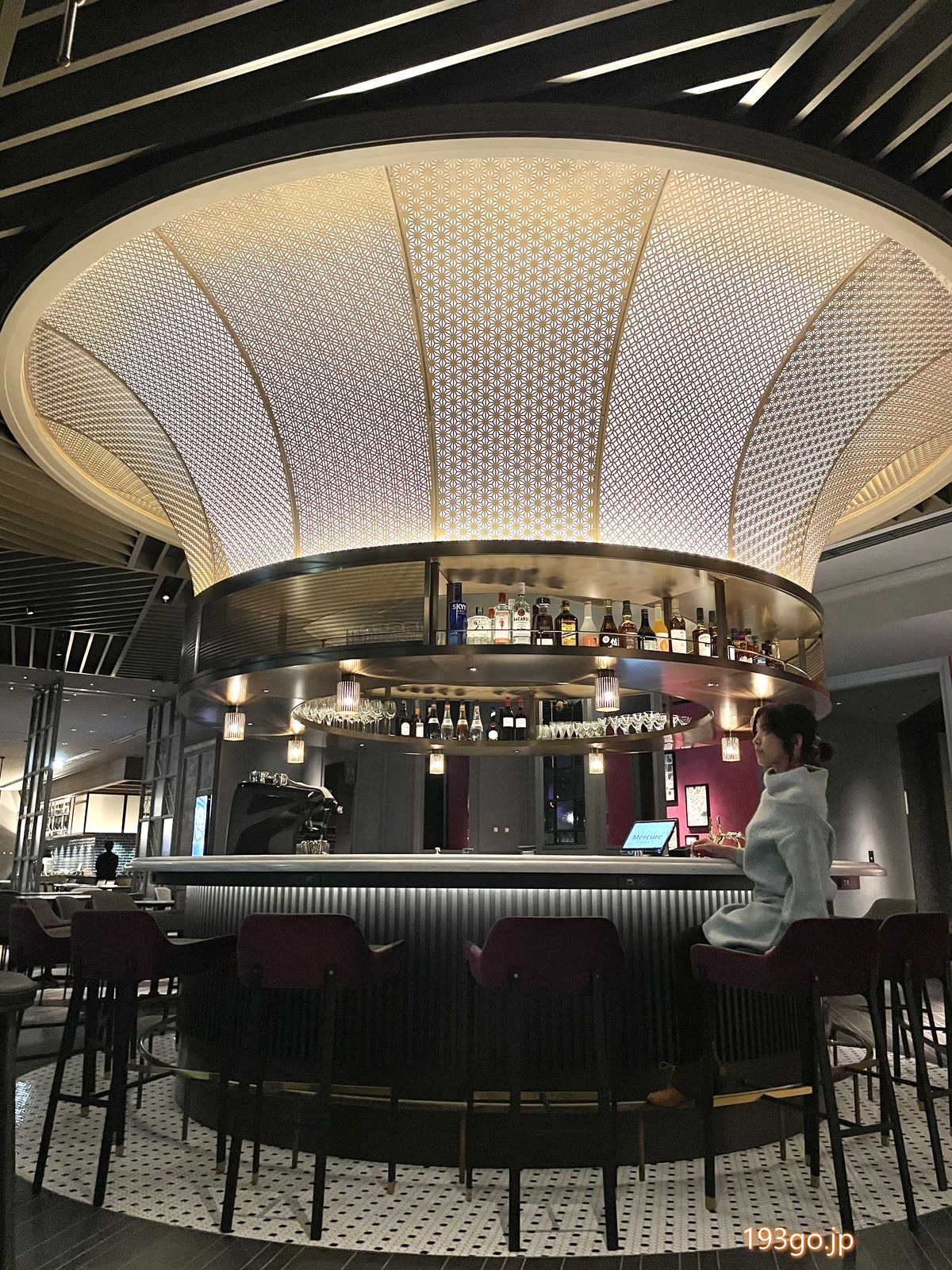 バーカウンターは特徴的なデザイン。日本の文様を施した金網で出来ている。
