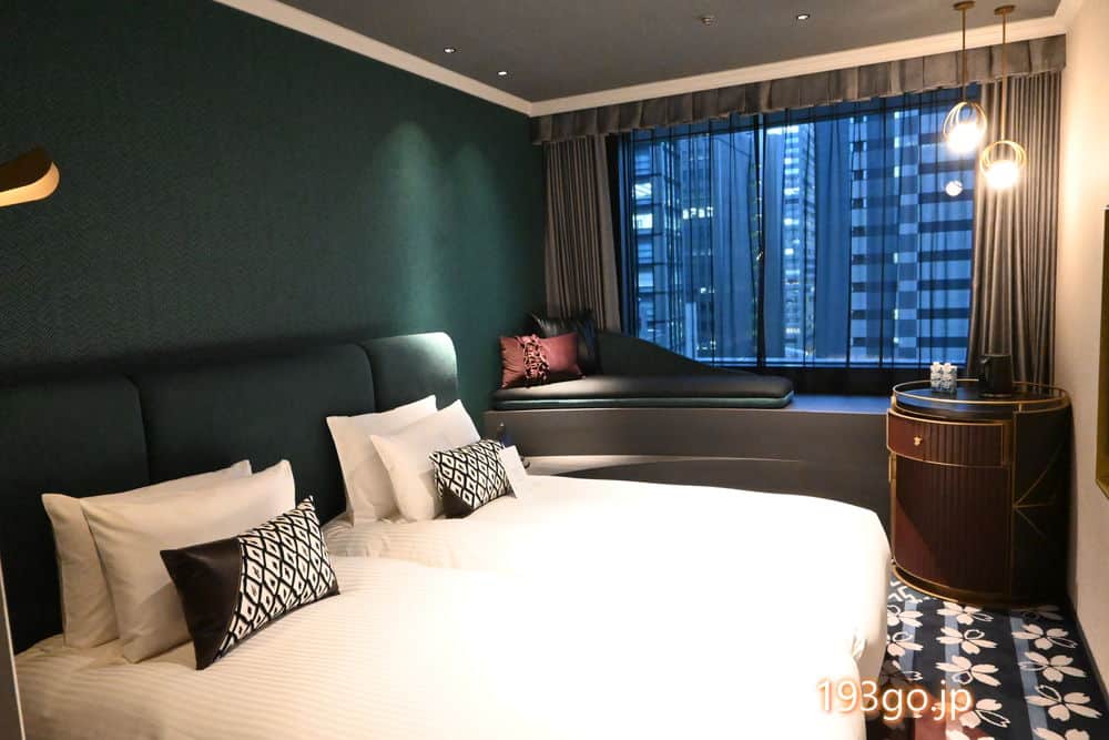 客室内はアールデコ調のインテリアで、ベッド二台、テレビ、Wi-Fiの完備。