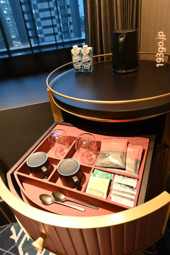 キャビネットにはポット、ミネラルウォーター、ティーセット、グラス、カップ、冷蔵庫。