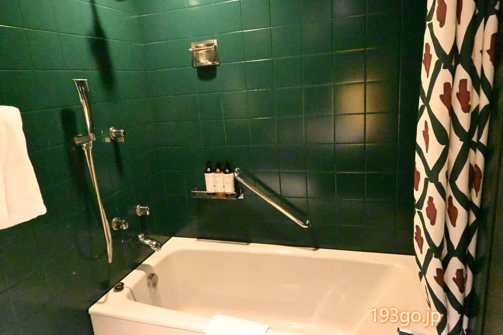 お風呂はレインシャワーとハンドシャワー、バスタブ付き。(バスルームは、以前のホテル・第一ホテルアネックスの造りがそのまま利用されている様)