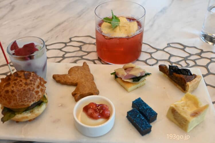 最初にスイーツ&セイボリー8種と、1つ目のペアリングモクテル。