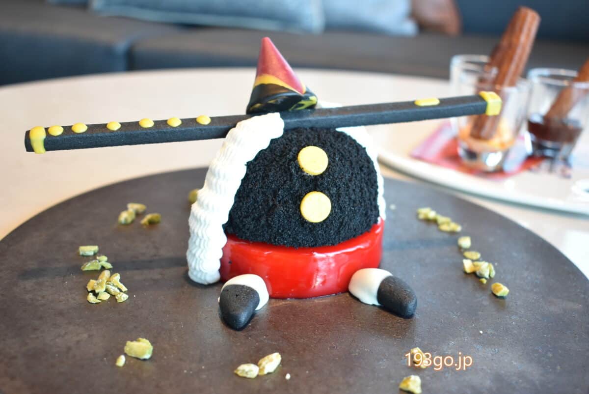 メインプレートは代表作「笛を吹く少年」をモチーフにしたドーム型のケーキ。