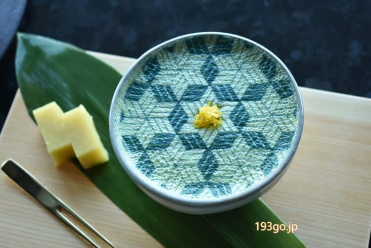1つ目は甘酒、抹茶、ほうじ茶などが使われた和モチーフの冷たいモクテル。自家製芋ようかん添え!