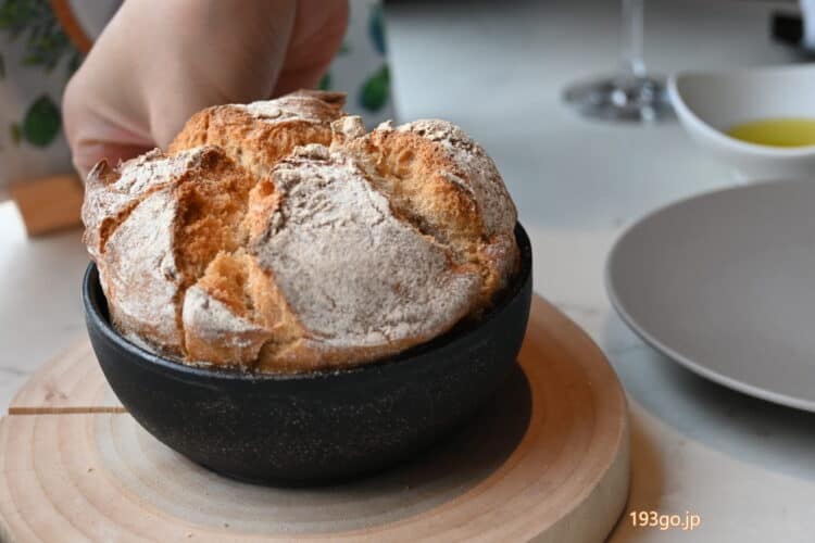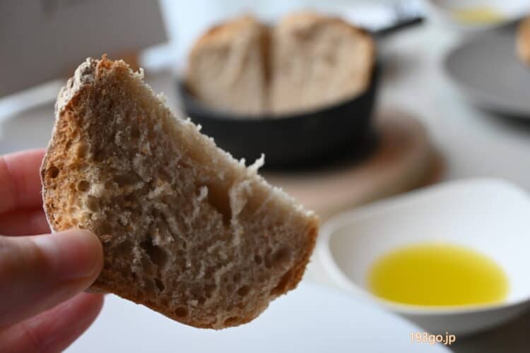 スキレットに熱々のパン。バリっと歯ごたえもあり中はフカフカ~。オリーブオイルを付けていただいたり、料理のソースとも合う。